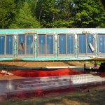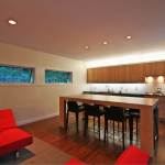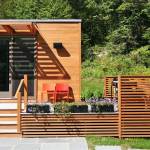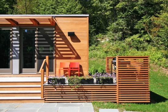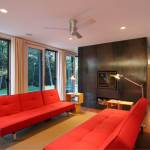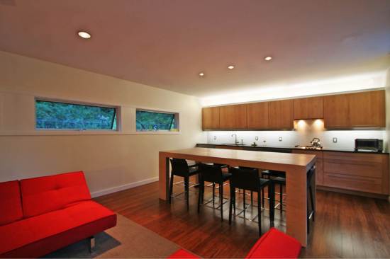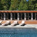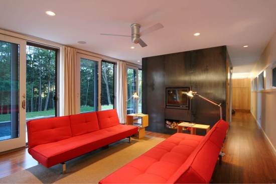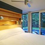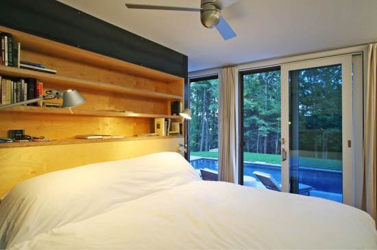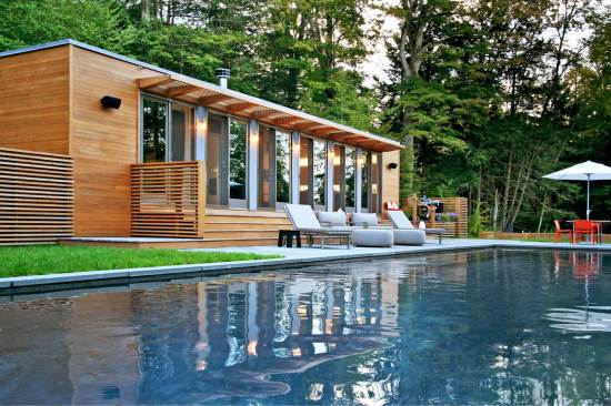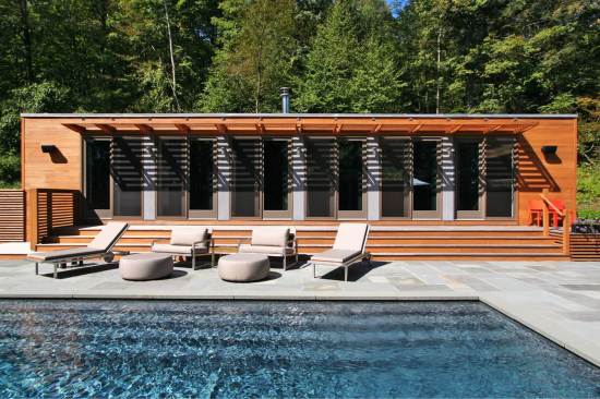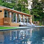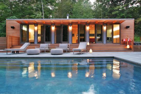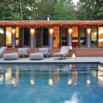 Located in a natural clearing within a wooded hillside of northwestern Connecticut, this retreat serves as a place for relaxation away from the hectic urban lifestyle. The 16 ft. x 52 ft. module contains a sleeping zone at one end and a kitchen/dining/living zone at the other. In between sits a black steel core volume containing the bathroom, laundry, storage, and a heat-generating fireplace. This core ‘floats’ in the space creating separation between the private bedroom space and the public entertaining space. The core is filled with natural light from a skylight above and frosted glass pocket doors. The single bar module is heated and cooled passively via the expansive wall of sliding glass doors on one side and the continuous slot of operable windows on the other. The roof is designed for solar hot water panels used to heat the pool and the module via radiant heat tubing beneath the bamboo flooring, supplementing the heat-generating fireplace. Exceeding energy standards, the perimeter envelope contains a special hybrid spray foam & fiberglass batt insulation system, thus retaining heat longer and minimizing energy use, as well as keeping the house cool in the summer. In the warmer months, cooling is passive and achieved via natural ventilation and evaporative cooling. As breezes blow over the pool, water evaporates and cools the air as it blows through the expansive sliding glass doors, through the 16 ft wide domestic space, and out the continuous linear clerestory windows along the back of the house.