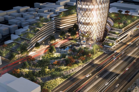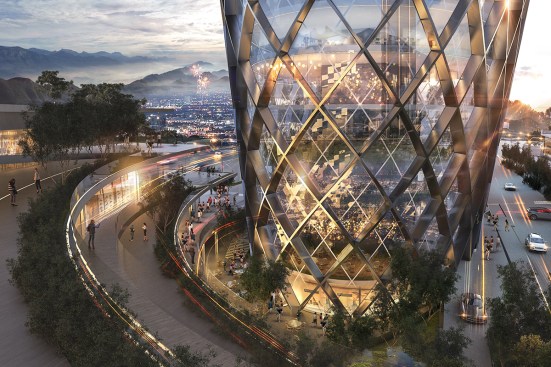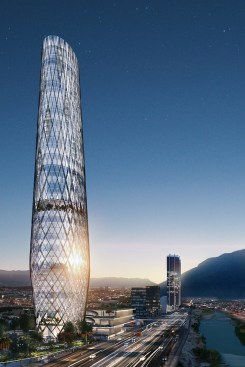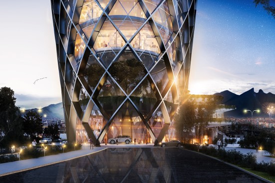 The main element of the complex consists of an outstanding tower –which combines offices, hotel, and housing in its interior– with a unique aesthetic that resulted from the integration of an innovative structural system to the façade of the building. This new tower rises 227.70 meters to become a new urban icon of Monterrey.