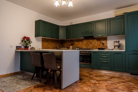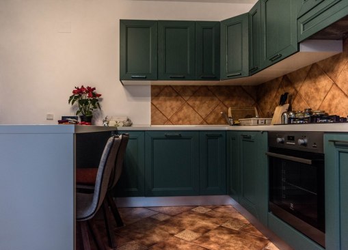 For the kitchen it was opted for furniture in shades of dark green, with the island for delimiting this area. Thus, the kitchen offers multiple areas for storage, but also an area for quick snacks and a generous place for cooking.