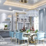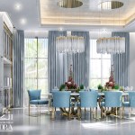 A combination of white, grey and blue colors with silver and golden details make this dining room extremely luxurious.