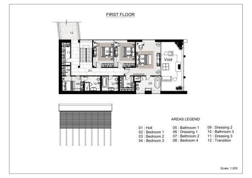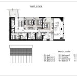 First floor: master bedroom, bathroom and dressing room; three guest bedrooms, two guest bathrooms, guest dressing room.