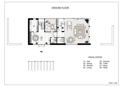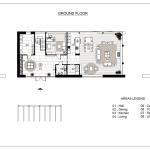 Ground floor: open space living room, family dining room with a kitchen, laundry room, cabinet, water closet, dressing room.