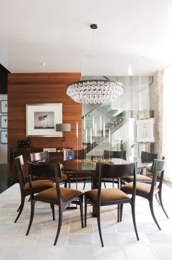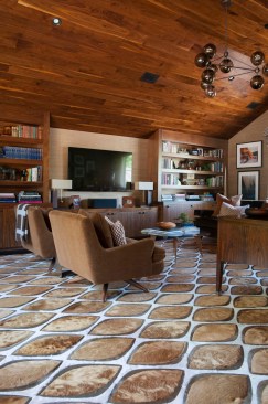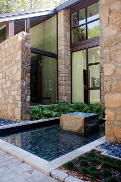 This residence was totally redesigned—the former home was razed except for its granite walls, which were left standing. Within that footprint, Harrison Design created a warm, contemporary home that is perfectly suited for its location, along a creek in a woodland area. In addition to the original stone, the facade features extensive glass and horizontal stained-cypress planking. In many rooms, double-height ceilings allow expansive glass walls complemented by 10-inch polished walnut floors and stone walls. A portion of the three-story home cantilevers over the pool, including the master bedroom, which feels like an intimate treehouse with three walls of glass.