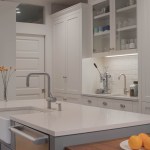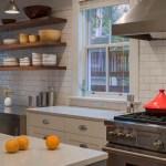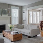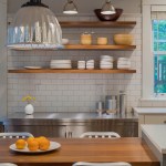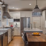 Our design carved out a larger kitchen/family room that is clean and spare, incorporating some traditional elements such as historic styled trim and subway tile, along with contemporary elements such as floating minimalist shelves and a built-in wood kitchen table attached to the center island. Some rooms, like the traditional Living and Dining rooms, were given a lighter touch: a new fireplace surround with subtle sparkle, or a modern wallpaper with a fun, neutral print. To tie the styles together, a natural palette with warm wood tones was maintained throughout the house, brushed steel finishes were used in both traditional and new elements, and the new shaker cabinetry kept to the style of the original home.