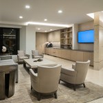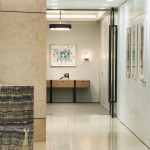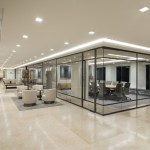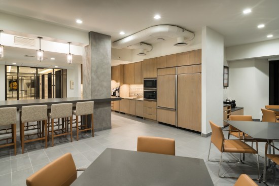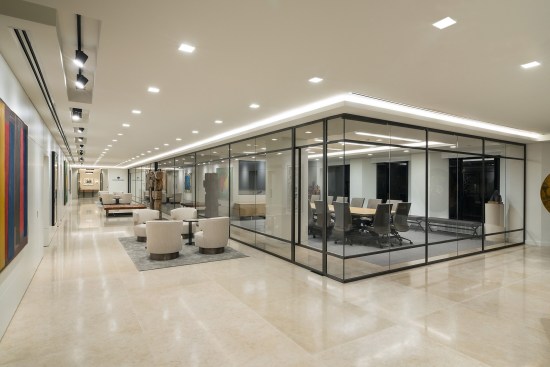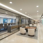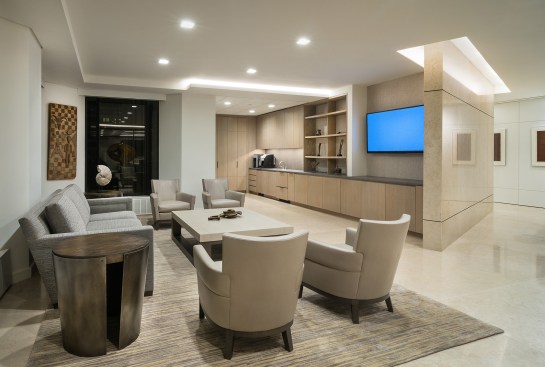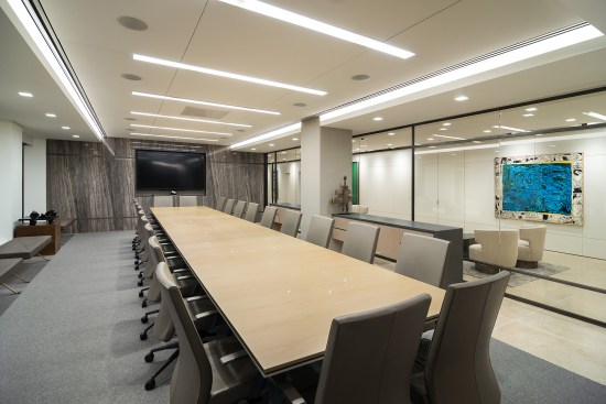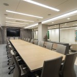 Open spaces abound, and high open ceilings and semi-open office fronts foster a loft-like atmosphere. An oversized reception area provides a warm welcome for visitors and is large enough to serve as a conferencing center for large gatherings of employees and clients. The central café space is accessible to smaller firms affiliated with Continental Grain that lease space on the floor. For private offices, floor to ceiling glass office fronts bordered by sleek black panels and double sliding doors create a sense of transparency. Private offices are designed to serve as meeting places, with built-in conferencing technology. In addition to providing a much more efficient use of real estate, the large floor plate provides a great deal of future flexibility, as spaces can be reconfigured to adjust to changing work styles over time.