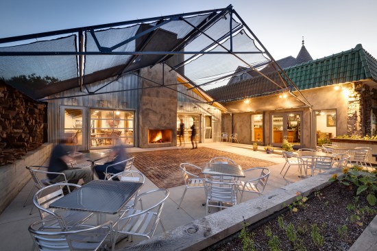 The transformation of the greenhouses started on Jackson Street where the design of the new facility “gives back” two bays of greenhouse space to the public to create an intimate outdoor courtyard. This space helps to create an alive-ness to the street and invites the community onto the property to help foster participation. The interior of the facility includes a café, a training kitchen, a large woodshop, and an event center that can be rented out to help financially sustain the mission of Convivium Urban Farmstead.