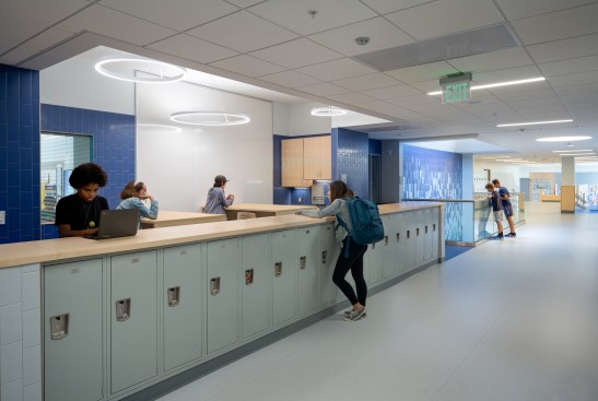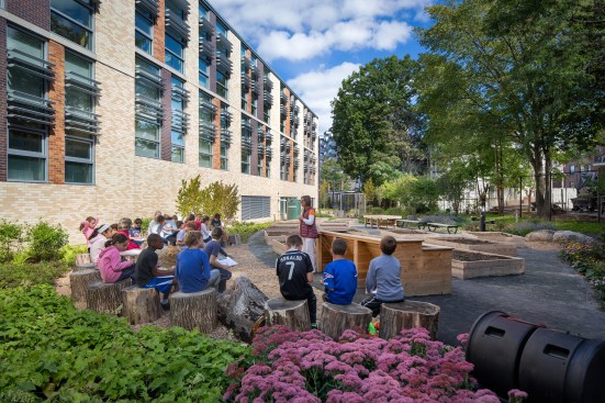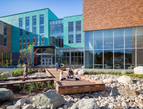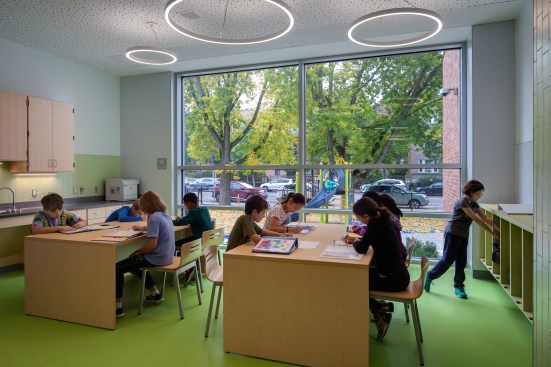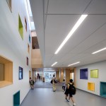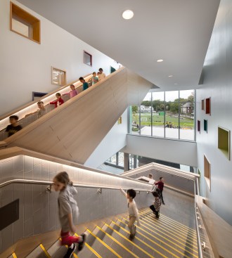 The design for the 1,000 student school allows grade levels to be clustered together to function as self-contained learning communities within the larger facility. Three main entrances converge on a double-height atrium and central stair that provides easy access to core spaces at the heart of the school. With outdoor classrooms, a rain garden, school gardens, and natural play elements, the school’s site is an integral part of the learning environment.