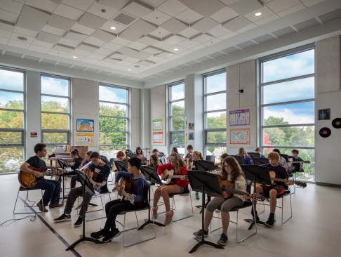 Located between a residential area and a busy commercial zone, the school complex continues a legacy of educational buildings that have occupied the site on Harvard Street. The two new academic wings frame the Georgian building and central courtyard, which contains a historic house from 1680, one of the oldest colonial structures in Brookline.