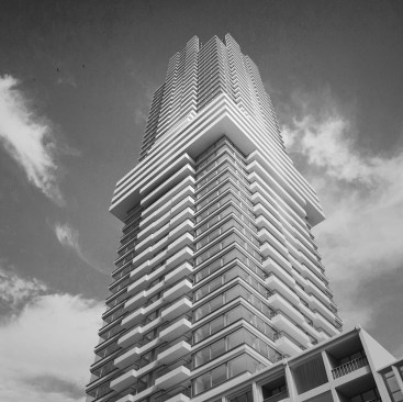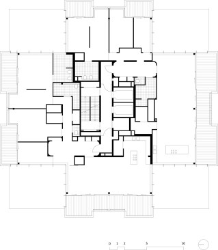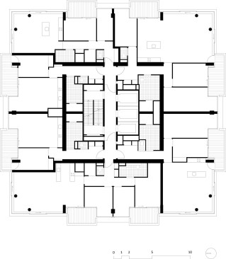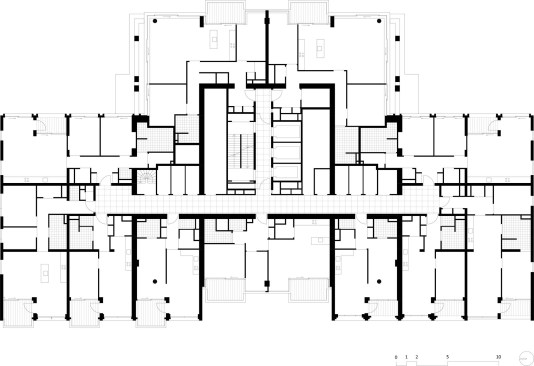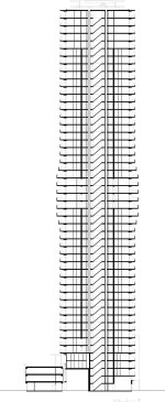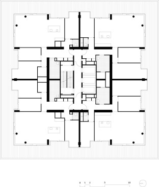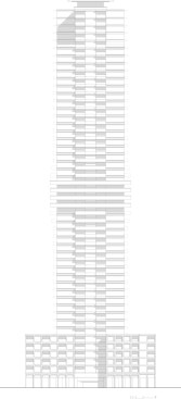 Through this intervention, the penthouses in the top crown have an equivalent—halfway, in the middle of the tower—with apartments having a continuous balcony along the facade.