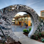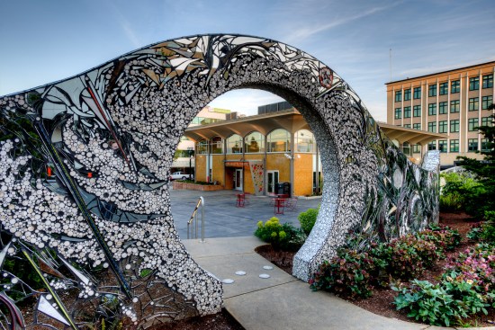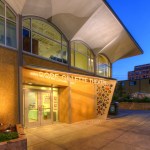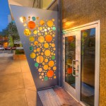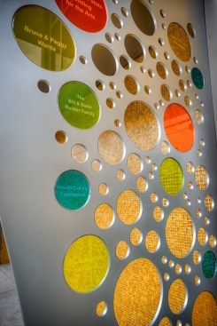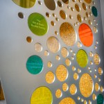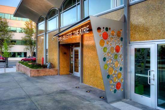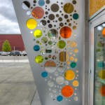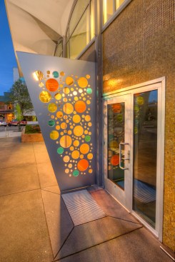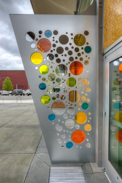 The new entry off the plaza is defined by a new signage structure that also acts as a way to identify prominent donors to the Kidstage program. The major donors were in the airplane manufacturing business so the signage structure was designed with references to that industry. The theater has since been named in their honor. The donor recognition wall is made up of colored glass discs with the donors names etched in them. The perforations also relates to a colorful reflective glass mosaic wall designed by a prominent Seattle artist.