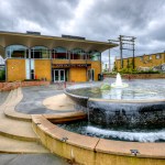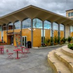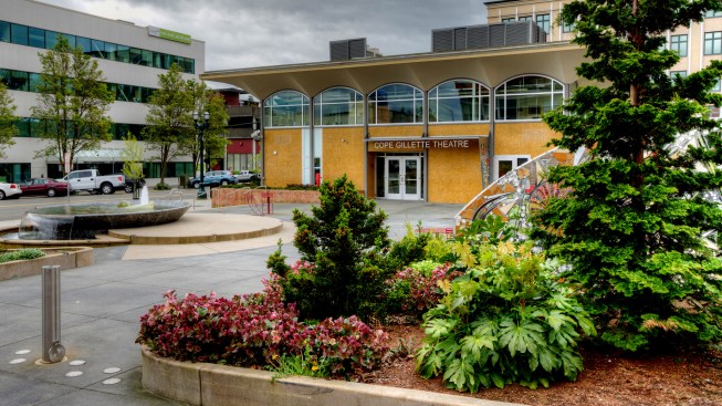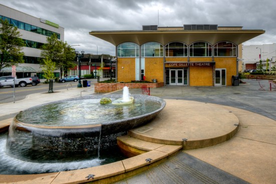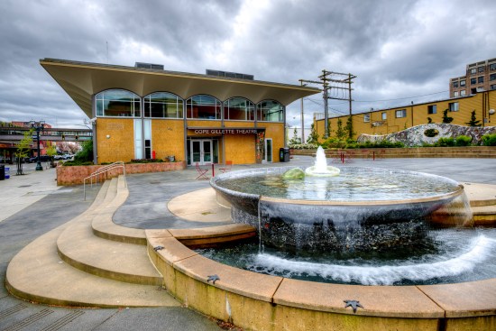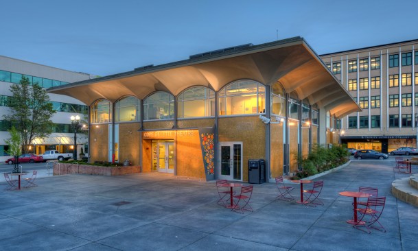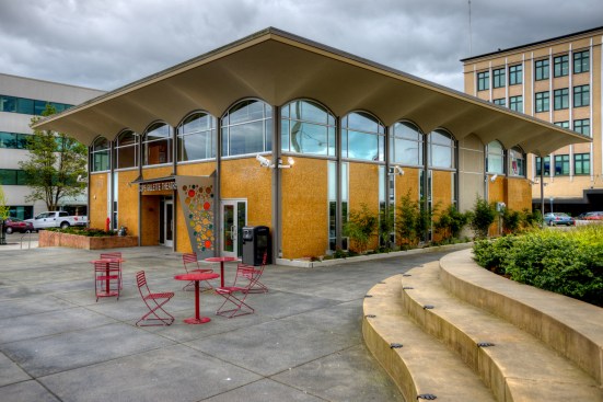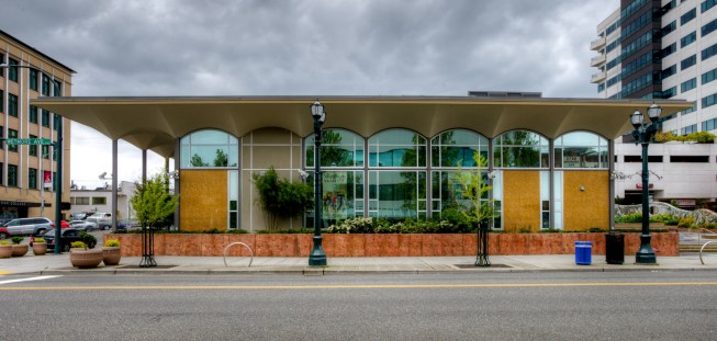 In 2005 the City of Everett acquired property adjacent to the Everett Performing Arts Center, including an existing bank building that was built in 1962. The bank building was a classic example of midcentury modern architecture and had recently been designated a historic structure by the city’s historic preservation commission. Village Theater administrates the Everett Performing Arts Center and in 2010 decided to lease the bank building to turn it into their youth education center. At the same time, the city decided to convert a parking lot between the performing arts center and the proposed youth education center into a city center plaza.