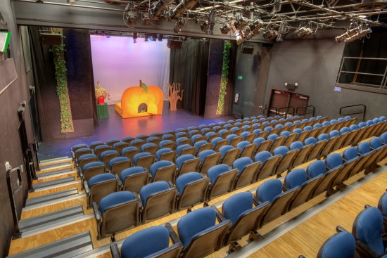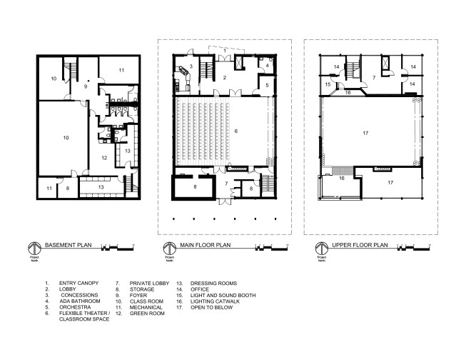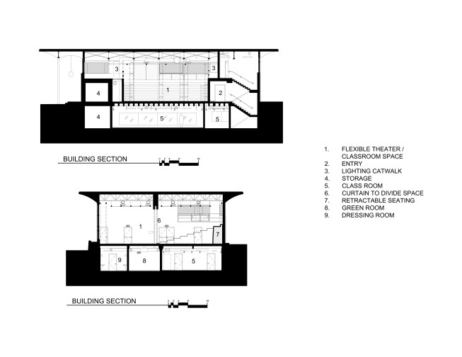 The existing bank building had a double height banking room and a mezzanine for its offices. The design strategy for the theater was to place the black box theater in the main banking room space and the administrative offices on the mezzanine level. Additional classrooms and the green room were placed in the basement.
