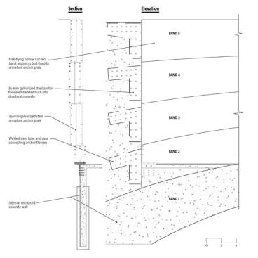 Where the self-supporting segments blur invisibly with those on the ground—which in some areas are pure surface ornament bolted to both sides of a concrete wall—smooth, factory-cast concrete armatures mediate the discrepancy between the steel bands’ low dimensional tolerance (1/10 of an inch) and the tenfold higher tolerance of the site-poured concrete. “When you stare at the building,” says Bruno, “there is no way to know what is cladding and what is not.”