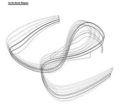 A variety of structural solutions enables the bands to twist and turn with elastic continuity. Internal cross-ribbing stiffens the hollow segments, which account for two-thirds of the total band structure. Peeling away from the galleries, these free-flying spans and cantilevers enfold outdoor circulation spaces. The spectacular central loop, for example, soars 100 linear feet before touching down to connect with the foundation. Disappearing momentarily underground as it hugs hidden concrete anchors, the bottom band re-emerges and lifts off, once again hollow, several yards further along.