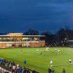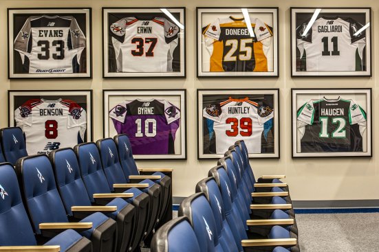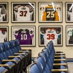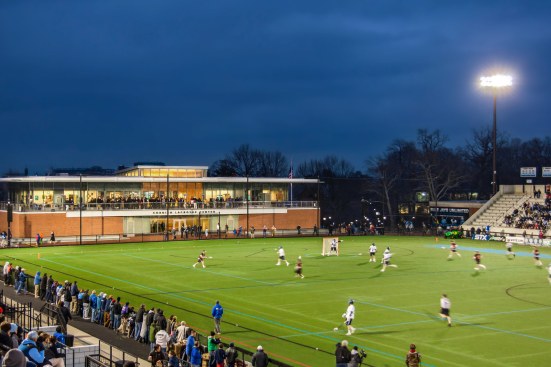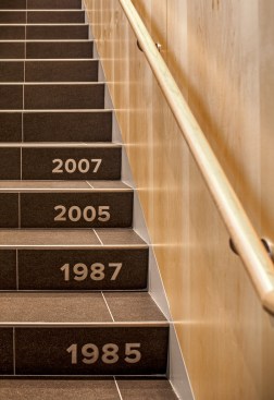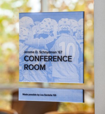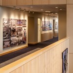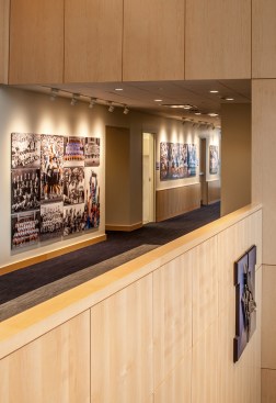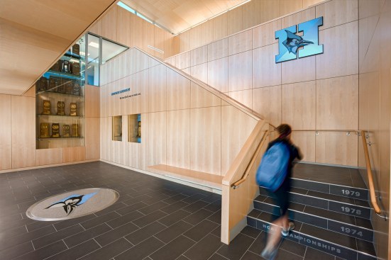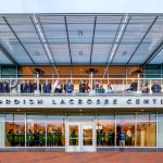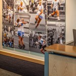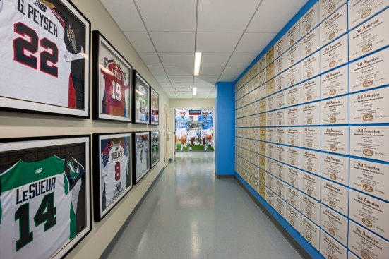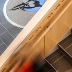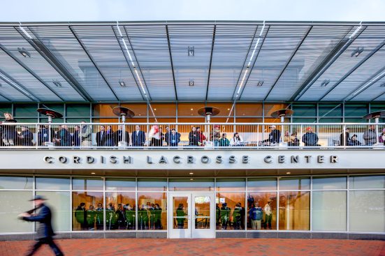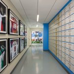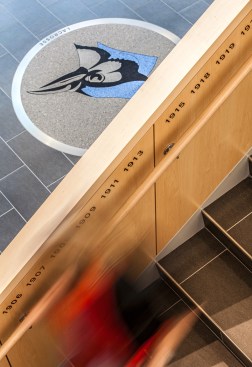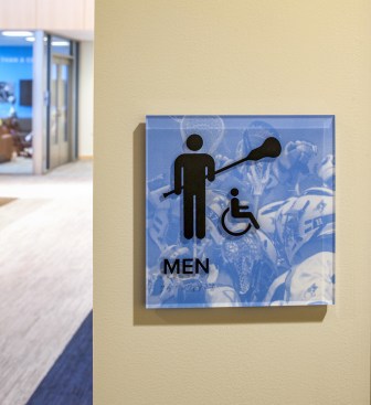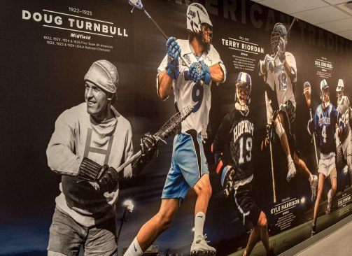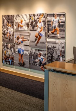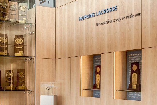 Overlooking the historic Homewood Field, The Cordish Lacrosse Center is the new home to Hopkin’s iconic men’s and women’s lacrosse programs. Balancing the collegiate brand of Hopkins with the bold and energetic identity of the Blue Jays, we integrated graphics, donor recognition and signage throughout the facility. The main vestibule celebrates historic achievements with a two-story trophy case and the staircase risers are imprinted with NCAA championship years. Back of house hallways and locker rooms are activated with large supergraphics of past players and awards, inspiring the athletes for future successes.