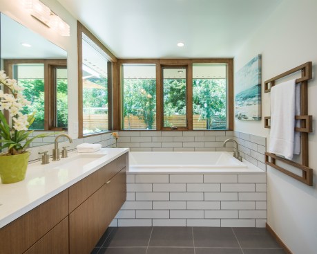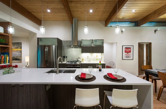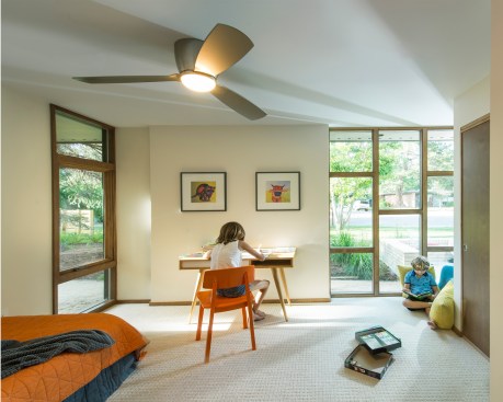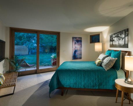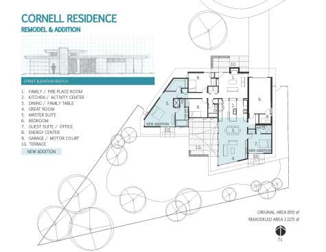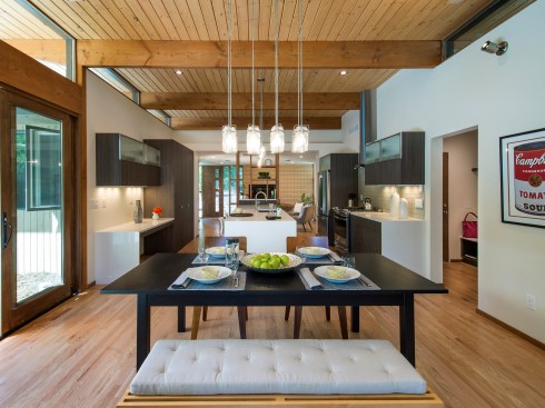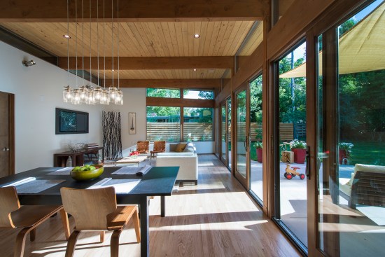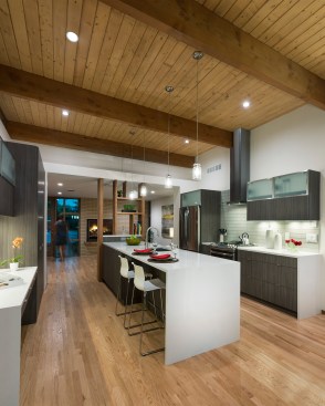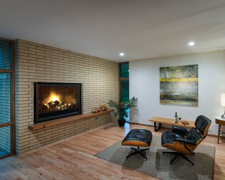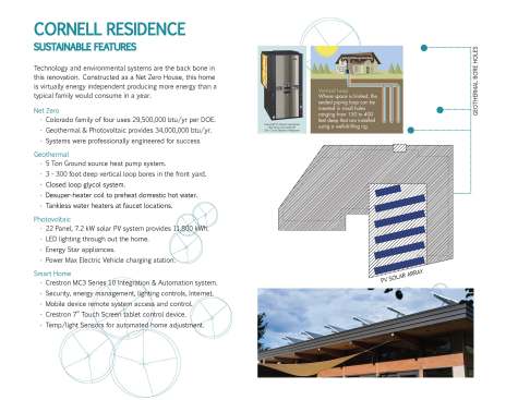 Seeking to enrich lives and the living experience by placing daily, family interaction at the center of design decision making and envisioning a next-generation home that is classically stylish in disposition and forward-thinking in environmental embrace. The ideal property was acquired in a mid-century modern neighborhood, consisting of 124 similarly-designed homes themselves originally conceived as contemporary, affordable, family-centric housing. The design begins with the intention of creating a heart of the home, an epicenter from which all activity and interaction spirals outward spilling into the yard and trickling to other smaller, private spaces. The original north entrance opened into a small dark, living room that felt as though it was being serviced by the adjoining kitchen, bedroom, and garage. Eliminating the overbearing sense of compartmentalization was imperative and opening the home’s potential meant creating a large airy volume of central living space by extending the kitchen up and out. Today, front-to-back sightlines across the core of the home impart a sense of connectivity from the first step through the door. Careful placement of the added square footage divided into two angular segments built-out to side yard setback lines preserves the backyard’s full volume while leveraging the sun’s southern arch across the property in pursuit of a net-zero footprint. Floor-to-ceiling windows flood the home with daylight enlivening every moment while a 7.2 kW photovoltaic system silently harvests enough energy for all of the electrical needs. A ground source heat pump uses the earth’s thermal consistency to heat and cool spaces and provides hot water to the home. An enhanced exterior envelope combines hyper-insulation strategies in the walls (R-30) and roof (R-52) with Low-E coatings on windows to reduce heat gain and thermal loads. Integrated LED lighting and energy star appliances, an electric car-charging station, and automated, remote-access smart-home technology all combine to make this historic home still many years ahead of its contemporaries. The contentious marriage between meeting today’s building codes and affordably preserving the existing historic architecture required an intense design introspection. Maintaining load-bearing window mullions and integrating code-compliant structural supports into an all glass wall called for steel reinforcements and custom-made steel plates for sistering joists, all of which were concealed within the historic framework. Highly articulated design detailing was required for all windows, doors, fascia, and base boards to maintain the historic character. Careful selection of interior finishes was imperative. The material palette was initiated with a warm, rich foundation of woods used on floors, ceilings, cabinetry and millwork in the main living space. Lighting, both natural and installed, plays an important role in establishing ambiance throughout the home and LED’s illuminate spaces at a hospitable, human-scale. Soft hues for surfaces and paints throughout the kitchen and baths are all deftly complimented by period-appropriate style lines resulting in a crisp, cohesive aesthetic. In preserving the home no detail was unattended and a botanist/landscape architect was engaged to assess the condition of the many mature trees on the property in order to help retain the yard’s secret garden quality. In designing, meeting these goals and challenges we have achieved a truly sustainable home that holds continual interaction as a core value of healthy family living.