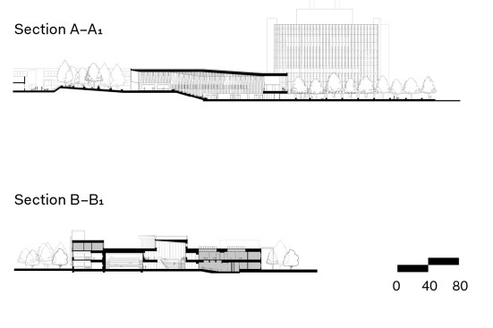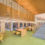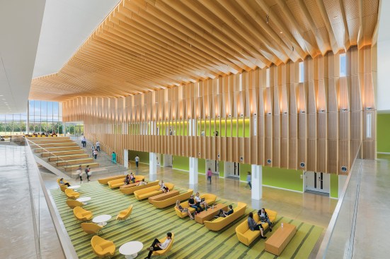 The subcampus includes facilities for research, students, and doctors. The problem until now, Manfredi says, is that “there was no place for those three worlds to combine.” The warren of structures that had accumulated over a half-century afforded no common area that could knit the various parts into a cogent whole. To create one, Weiss/Manfredi cut into the compound on its western side, inserting an oblong volume fronted by a landscaped entryway; the structure rises slightly to face another courtyard in the rear. Along the building’s central axis, the designers created an airy atrium that acts as both a lounge and a connector, its interior lined in ribbed wood and with a custom carpet whose vivid green mimics the exterior forecourt. “It’s like having a year-round garden,” Weiss says—a key asset in a city where winter lasts for nearly the entire academic year.