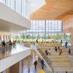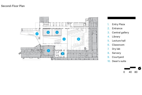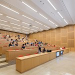 Along the atrium’s flanks are a suite of amenities that include a cafeteria, a flexible classroom/amphitheater, and a library; these complement additional interventions, among them the recladding of an existing high-rise to match the new structure. The result is a visually coherent gateway to the veterinary compound and a quietly monumental endpoint to Tower Road, the major east-west corridor between Cornell’s historic Arts Quad and its growing technical and research satellites. For the animal saviors of tomorrow, so long accustomed to dark and dreary environs, the renovation is a welcome change, creating order out of the architectural chaos. As Manfredi puts it,
