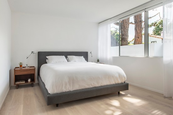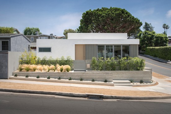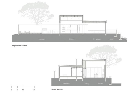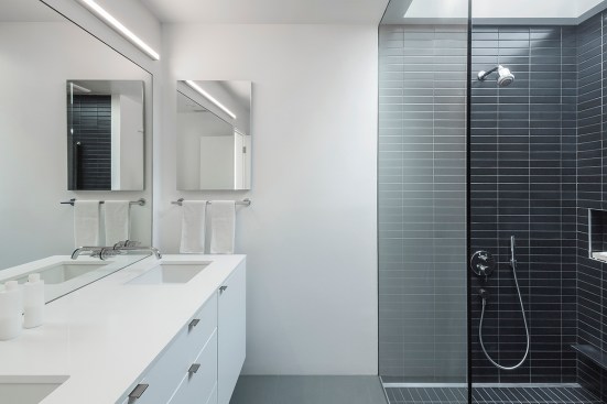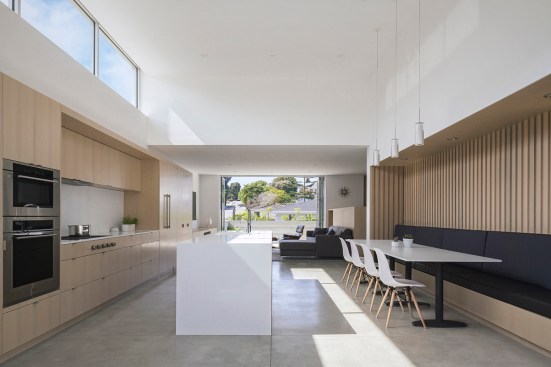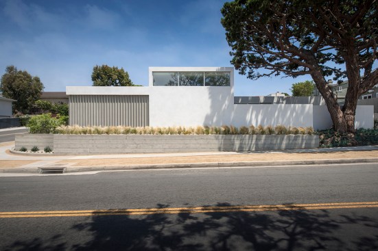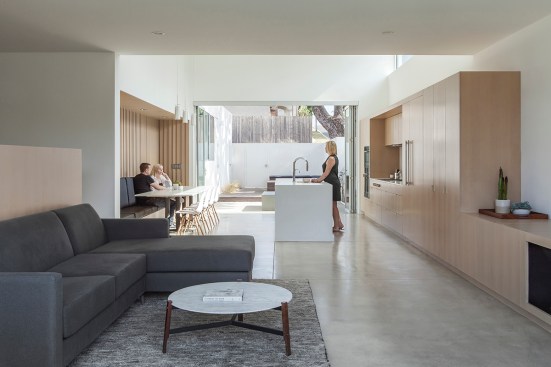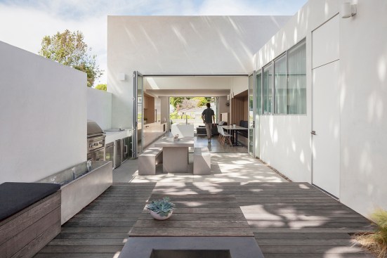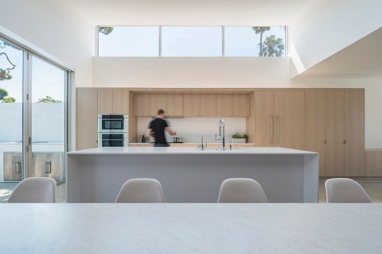 The design strategically resolves these challenges through a series of straightforward moves and simple forms. The house’s long street elevation is buffered by an interior lining of cabinetry, forming a thickened acoustical barrier. Site walls elevate the house from the street, and clerestory windows wash sunlight into the double-height kitchen. Large folding glass doors allow the main common room to be dramatically opened at opposite ends, optimizing light penetration, cross-ventilation, and spatial flow through to the tree-shaded courtyards. To fortify the union between old and new, the existing roof has been flattened and the building finished in smooth white plaster. Finally, a series of vertical cement board fins wrap the street-side corner, thereby reinforcing the movement of turning around the building.