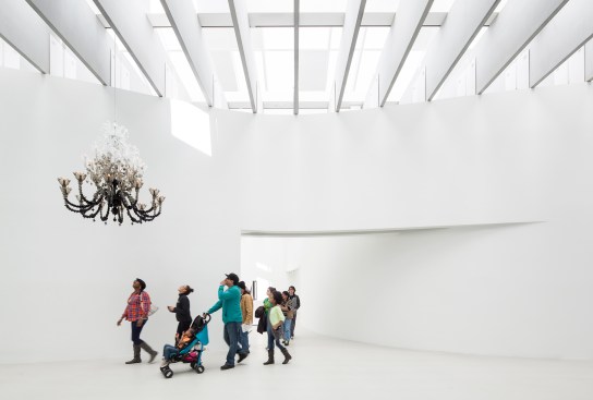 The architects began by leaving behind the boxy contours of the building’s square-planned envelope—which fills out a museum complex with wings by Gunnar Birkerts and Smith-Miller + Hawkinson Architects—opting instead for gently curving white interior walls that seem at times to disappear. The sensation of unbounded space is accentuated by a lighting solution that puts the focus on the work: Raked ceiling beams, acting as louvered shades, direct filtered natural light onto free-standing display cases in the middle of the galleries. The sunbeams strike the colorful objects within, enhancing their vibrancy in such a way that they seem to float against the room’s white backdrop.