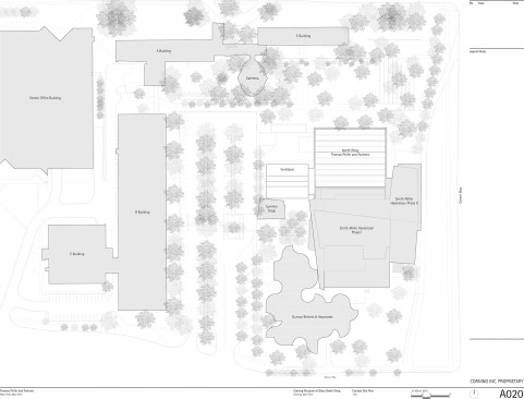 The sidewalk experiment was prompted by the commission to add a 100,000-square-foot, $64 million wing for contemporary art and design to the Corning Museum of Glass in Corning, N.Y., a company town where the eponymous glassmaker has been headquartered since 1868. The addition features a 26,000-square-foot, single-level gallery over lower-level offices and adjoins an industrial shed from the former Steuben Glass Factory that has been converted to a 500-seat glassblowing demonstration theater. The administrative campus is already a timeline of the architectural applications of glass, as is the museum building: the 1951 glass-block and curtainwall International Style original by Harrison & Abramovitz; Gunnar Birkerts’ 1976–1980 addition, all mirrored angles and tinted curves; and Smith-Miller + Hawkinson’s 2001 galleries and admissions lobby, a study in cable-stayed structures and fractured-seeming geometries.