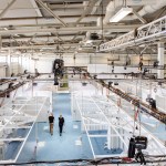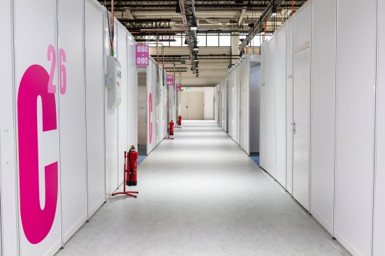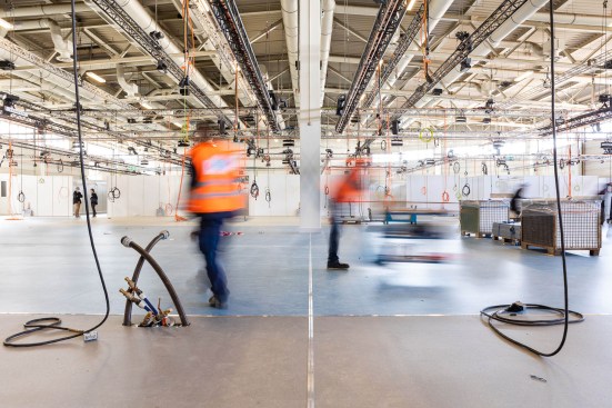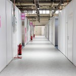The layout of the treatment centre is based on modular clusters with 16-24 beds and a central service zone. The structure of the clusters is adjustable depending on the intensity of care. The advantage of the cluster system, in addition to its flexibility, is the opportunity to be installed in other locations as well. The oxygen lines for each bed space as well as the electrical and data technology supply are provided via cross beams, so called traverses, suspended from above. This design, typical of the trade fair and event area, allows a high degree of flexibility and also ensured that the ambitious deadlines were met.