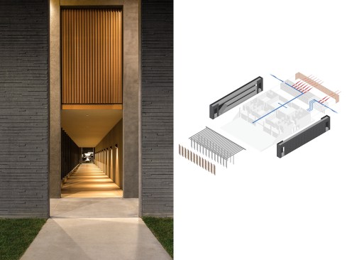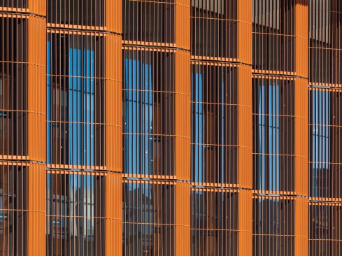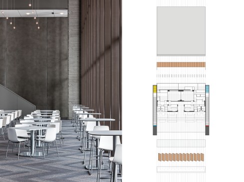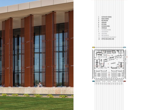 The final fifth slice consists of a loggia and overhead mechanical bar. This layer was the result of integrating what would have been a more typical rooftop mechanical penthouse into a long linear sequence of mechanical air handling units, kitchen compressors, condensers, water heaters, and chillers. The resulting strip of hidden mechanical rooms intake and exhaust air through a uniform copper scrim screening louvers and openings as required to meet equipment needs. The loggia connects the new employee and visitor parking lot to the new corporate office building via a bridge over a basement level service dock.