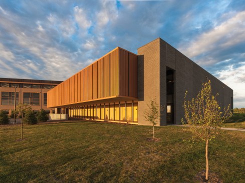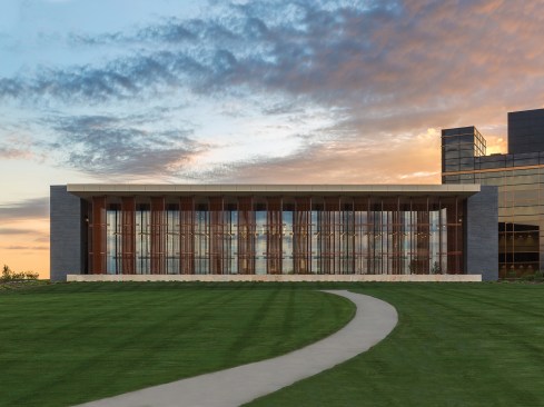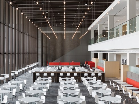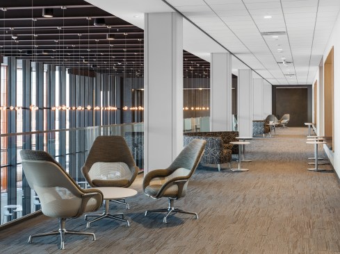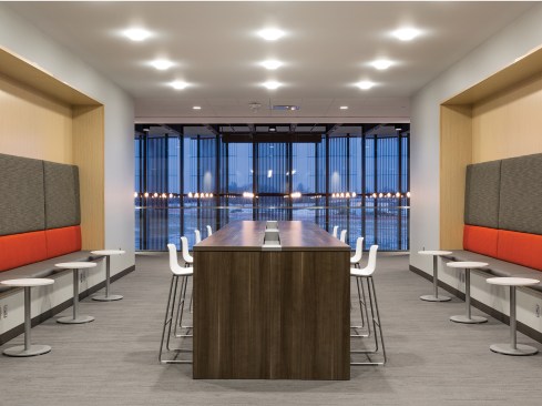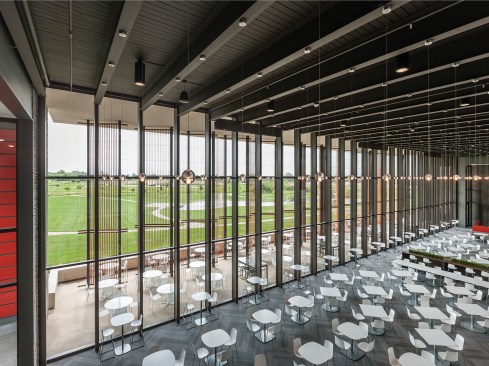 A large corporate office expansion on a 160 acre park-like campus in West Des Moines required a new cafeteria and training center to serve the growing employee population. The owner recognized that a cafeteria and event-training center often create the first impression for new employees and guests visiting the corporate campus. As a result, creating an event space with a civic scale and a strong connection to its landscaped surroundings was a priority. In addition, utilizing a material palette that was sympathetic with the existing campus was identified as a contextual response that would integrate the new building into the existing corporate campus. These client aspirations served as the impetus for the resulting building design.
