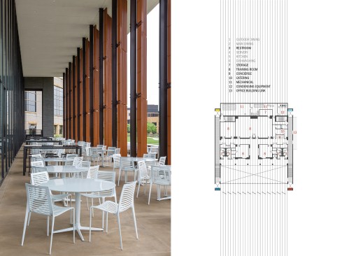 The second slice reveals the main dining/campus “town hall” event space. The porch, with its screening and deep overhang, allowed the glass to reach the lowest shading coefficient available – providing the clearest glass for views, daylight harvesting, and accurate color rendition.