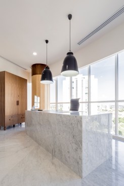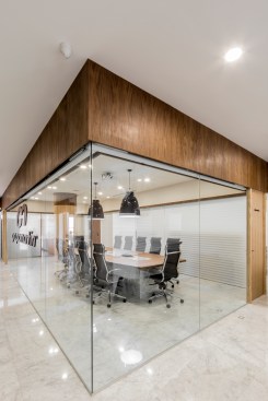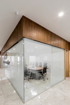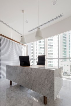 As the elevator doors open, clients are welcomed by a transparent meeting room, as a symbolic gesture for open dialog; the space receives us without words and unobserved. The receiving area, naturally guides us to the reception, where the main piece of furniture, with its lithic presence, allow us to intuit the natural sequence of spaces that will follow. Large dividing glasses, seem to intersect each other, leaving vast spaces for free circulation, to provide access to the general working area.