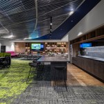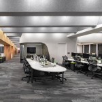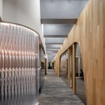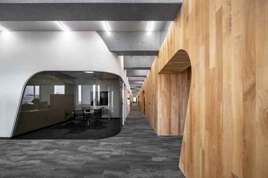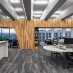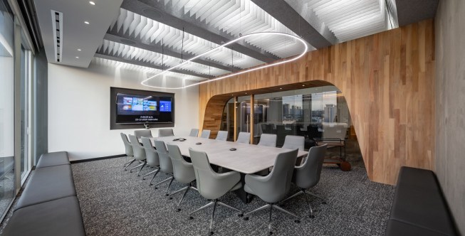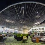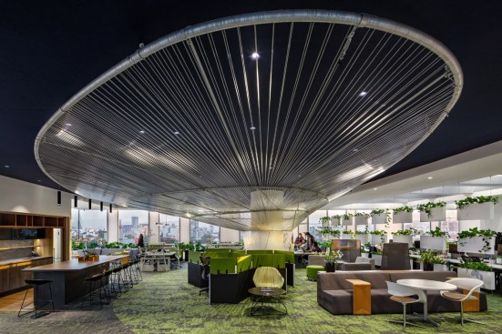 Una de las directrices de diseño fue el confort acústico y el elemento más protagónico es la pérgola. Su objetivo fue exaltar el valor de la estructura —una losa casetonada que se ve reflejada en el pergolado de gran escala— que al recubrirse con paneles de PET reciclado se transforma en un elemento casi escultórico con cualidades fonoabsorbentes. En las oficinas privadas se colocaron tapices y lambrines acústicos, además de alfombras de tráfico pesado carbon neutral floor.