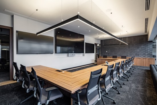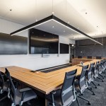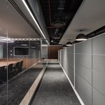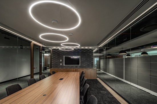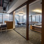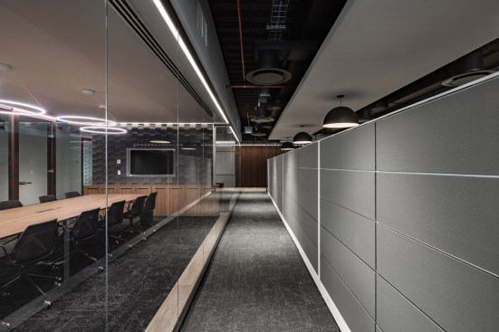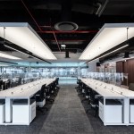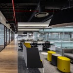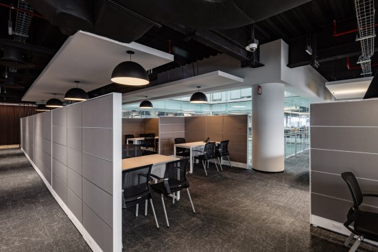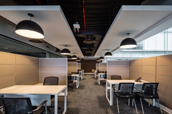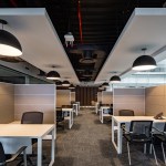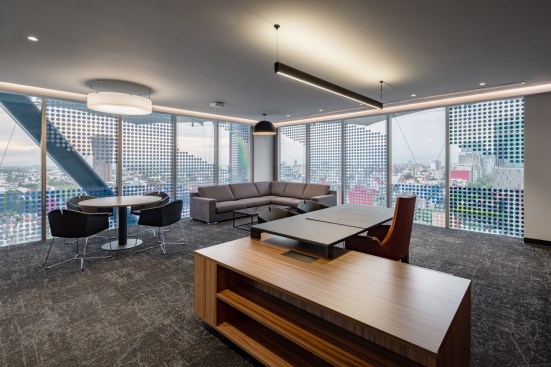 The apparent slab allows to have as most height as possible and where a system of suspended plafonds, with integrated direct lighting, was installed. For the closed spaces acoustic plafonds were designed and located at the center aligned with the furniture. For the casual areas attractive lamps were selected to create a different ambiance that adds to the materials selection giving formality that unifies the whole project with accents of BanCoppel´s corporate color.