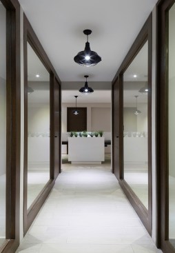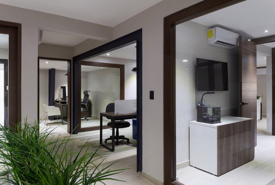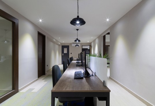 A reception area was created and framed with a wood cover that goes up the wall and turns to be transformed into a light plafond with a simple and dynamic geometry that wraps the space. The operative areas were distributed in bench type workstations and linked to the different areas that, for the privacy of their operation, require closed offices.