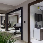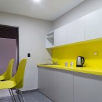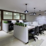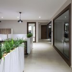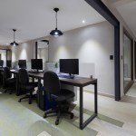 Grey ceramic floors cover the floors and a series of carpet rugs with uneven patterns were placed on top to have both color accents and acoustic comfort. The partitions for the closed offices have large windows to have transparency and light towards the operative areas, among the vibrant color accents of the kitchen and the vegetation points that transform the neutrality of the whole project.