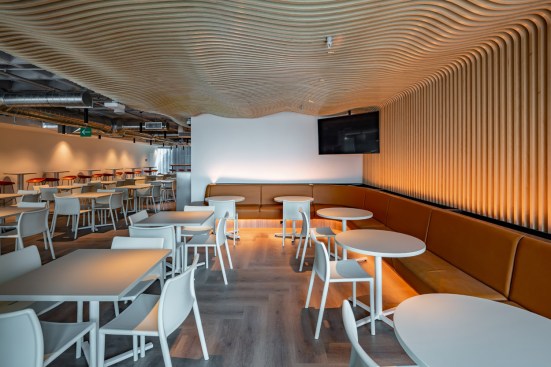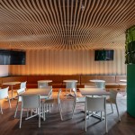 The kitchen, dining room and training rooms were located on the 11th level. The last two may be joined thanks to a system of mobile partitions with the purpose of creating a much bigger space, Town Hall, that allows to have corporate events with a large number of assistants.