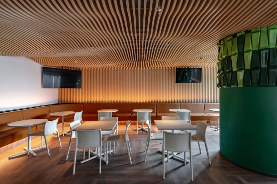 The training rooms have a hall with cushioned benches and square tables that may be also use as waiting room, as well as collaborative spaces or for retreat for collaborators searching for a change of scenery. The general project locates the informal collaborative areas between and close to the workstations for the users to have the opportunity of meeting without the need to reserve a meeting room.