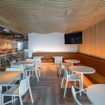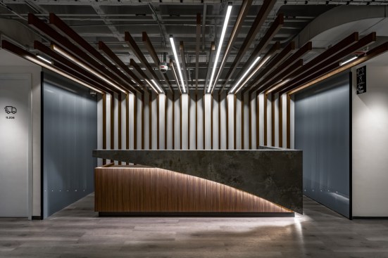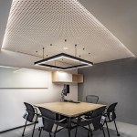 The plafond´s design adds motion and a dynamic touch with the drywall moldings in two levels and colors (white and gray) to emphasize the effect. In the open areas the ribbed slab was left exposed, a constructive characteristic that shows the time when Torre del Ángel was designed, revealing its history and scoring the sensation of a greater height.