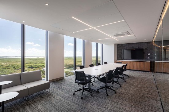 The selection of materials and finishes from the carpets allowed us to create the reminiscences of the mangroves and beaches that abound in the area, allowing us to create infinite views that merge with the spectacular views towards the mangroves and lagoons. All carpets contain more than 70% recycled nylon, along with a backing that allows us to release the humidity that the space can have due to the change in temperatures.