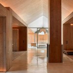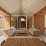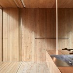 There is a subtle hierarchy of heights within the interior spaces: the gable is nearly 20 feet tall; the living room and kitchen ceilings are about 9.5 feet high, the master bedroom ceiling is nearly 9 feet high, and those in the guest rooms are just over 8 feet high. Vertical timber planks, each 20 centimeters (7.87 inches) wide, clad the living spaces, inside and out. Even the concrete formwork followed this module, so that the exposed surfaces bear imprints of the same dimension.