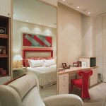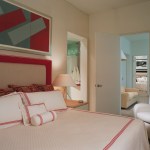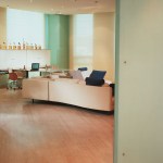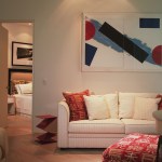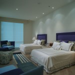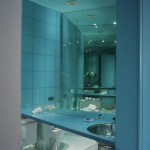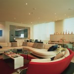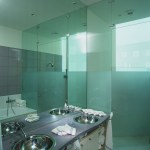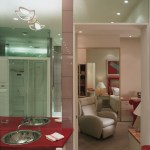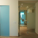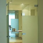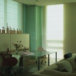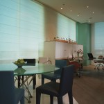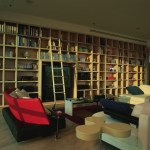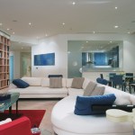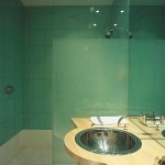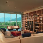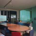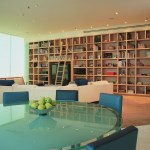 Glass enclosed kitchen, wall to wall library, Italian furniture, colored baths.