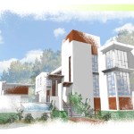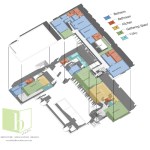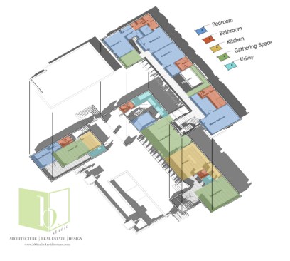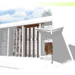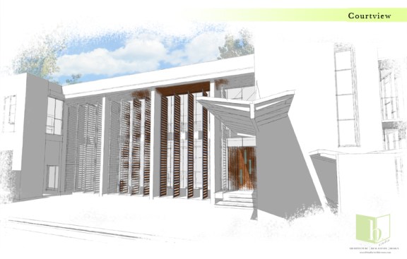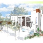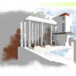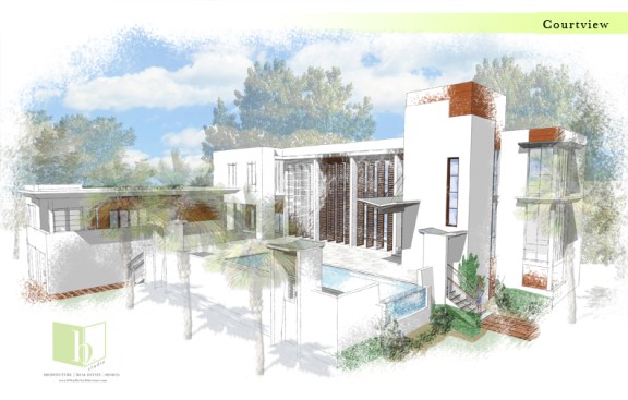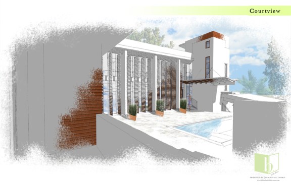 A corner lot with its best views across the street, this home looks to strike a balance between privacy and openness. A private pool court is central to the home, with all of the public space opening onto the deck. Large vertical shutters create privacy, shade, and can pivot to protect the glazed walls from storms. A guest apartment or office with a green roof sits atop the garage, enclosing the courtyard and focusing the view. A pronounced stair tower rises to the main roof that can accommodate a mixture of lounge space and green planted roof, with exceptional views to the horizon. It’s a space for living, working, and entertaining…