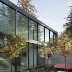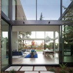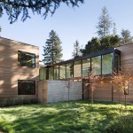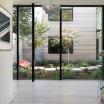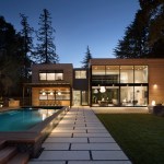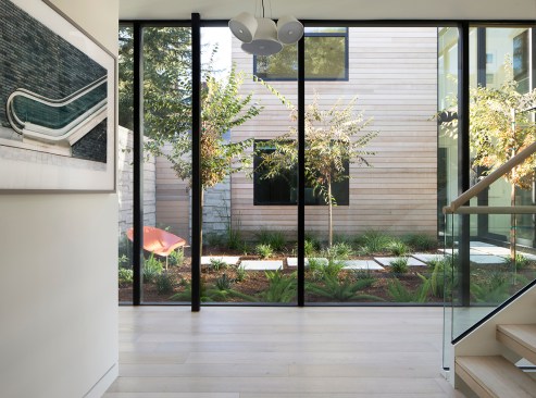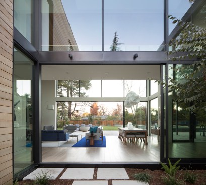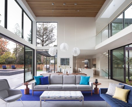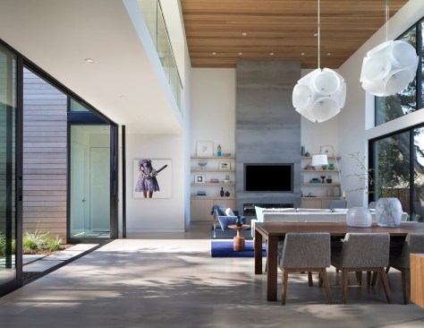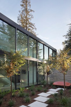 Nestled among a heritage redwood tree and mature oaks in a quiet suburban neighborhood, this Menlo Park residence was designed around a series of outdoor experiences. Minimalist and modern, the house consists of four distinct wood-clad pavilions connected by glass walkways that surround a central courtyard and open to an expansive backyard complete with raised pool and lounge areas. A covered walkway frames the entrance, leading to a double-height living / dining space. Bookended by outdoor spaces, the pavilion highlights the simple material palette of cedar, blackened steel, glass, and concrete, and is the backdrop for the homeowner’s collected art pieces.