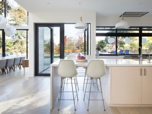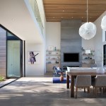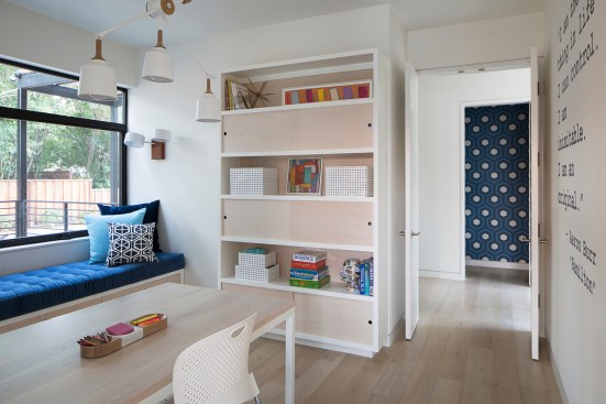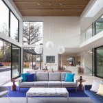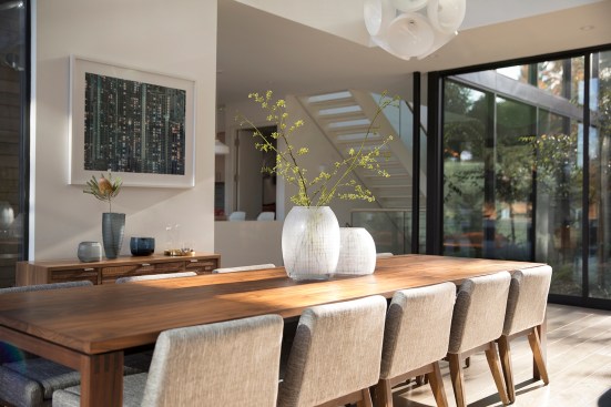 The family of four tapped John Lum Architecture to design their new house to be a reflection of their characters, blending his crisp-line, ultra-modern aesthetic with her flair for artisan materials and bold blues. With two teenage daughters, the house is as practical as it is minimal. Enlisting the help of Stephanie Zaharias Design, the owners selected organic patterns and durable finishes that integrate the project into its natural environment. Comfortable furniture evokes livability. Hard surfaces, from glass panels to backsplash tiles, offer long-lasting resilience. A color-block rug adds an element of play and can withstand the wear and tear of everyday. Built-in casework maximizes space. Minimally framed windows and a dynamic facade filter in sunlight and fresh air.