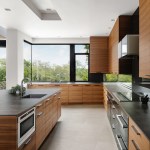 The kitchen boasts micro-thin countertops, “floating” upper cabinets, and glass faced drawers and appliances.