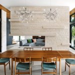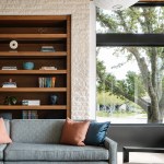 Interior spaces are neatly detailed with trim less metal door frames, reglet cut flush base boards, and brake metal window wraps. Native limestone forms custom wall sconces, hidden receptacle “caps”, and a floating fireplace. Custom wood ceiling planks align perfectly with square and linear fixtures while flush commercial grade air diffusers and sleek trim-less downlights minimize clutter at gyp. board ceilings.