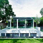 The two-storey house is a simple composition of two interlocked white cubes, which is entirely shielded from street view. The planners limited to a single-storey height so DSDHA had to half bury the house. The exterior presents itself as a low-rise, lightweight architectural piece of architecture, clad in white render, with chamfered mirror reveals. The house also has to follow strict rules to reduce over looking from neighbouring gardens: it has a stepped roof line in section so it is lower close to garden boundaries, from which it is set back clear from on all sides.