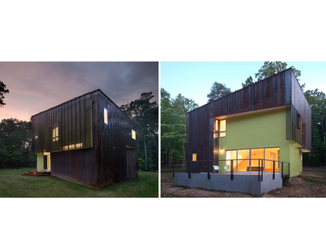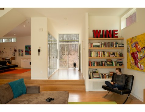 The clients came to us with the intention of building a simple, modern, affordable home in a clearing amidst a lush forest on their 6-acre property. Our clients wanted a unique house that would provide them with spaces where they could be creative. We sited the house carefully to maximize natural lighting and to frame views of forest, including a favorite three-trunked tree, to disturb the natural environment as little as possible and accommodate the surrounding wildlife.