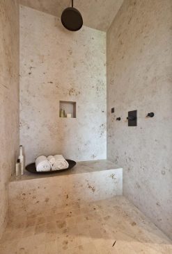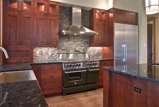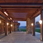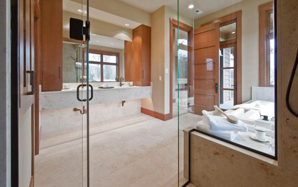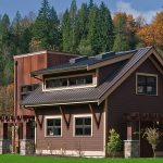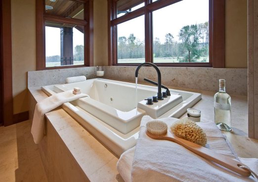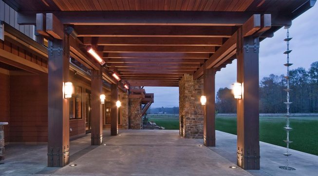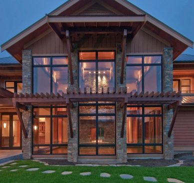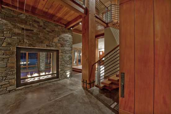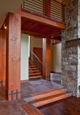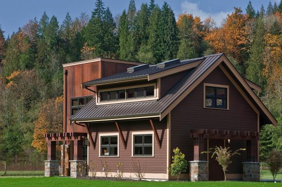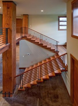 Sitting on a 15-acre plot in Auburn, Washington, near the Green River, Estate Homes created a 6,000-square-foot custom home for an outdoorsy couple. Built with a bespoke timber frame, the home is composed of natural materials and takes inspiration from the lot’s only pre-existing structure: a small rustic barn, just 75 feet away from the residence. Clad with stone from Mt. Rainier and rusted corrugated metal, the exterior has a rich, copper tone that gets even better with age. Along with an expansive outdoor patio, the home features a two-story garage that doubles as a pottery barn and dog washing station.
