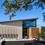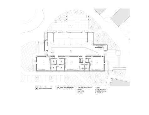 Three large classrooms are specialized for orchestra, band, and choral music practice, all with excellent acoustical characteristics and tall ceilings achieved by lowering the ground floor five feet below grade. An 84-foot wide painting and sculpture studio is filled with daylight from north-facing windows, and glazed sectional overhead doors open the studio to the gallery. Upstairs, rooms for photography, digital arts, drama and department faculty are accessed from walkways surrounding and bridging the gallery. A trellis, bench and kiln shed define an exterior workspace.