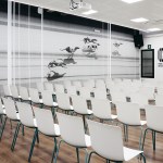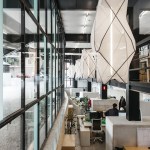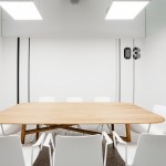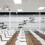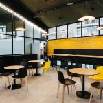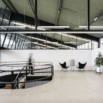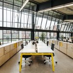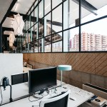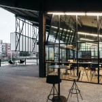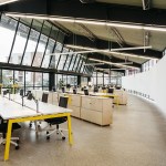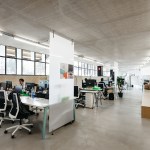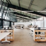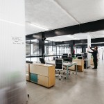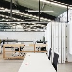 Warm materials like wood and wwcb acoustic panels were used to contrast with the pre-existing steel structure and concrete floors and to create comfortable and pleasant space.